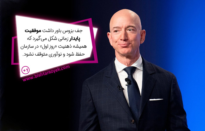 - چرا به فلسفه «روز اول» معروف است؟ او معتقد است شرکتها باید همیشه مثل روز اولِ استارتاپ عمل کنند؛ یعنی با چابکی و تمرکز بر مشتری.